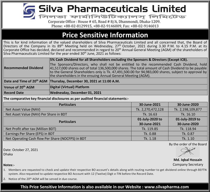 Price Sensitive Information of Silva Pharmaceuticals Limited