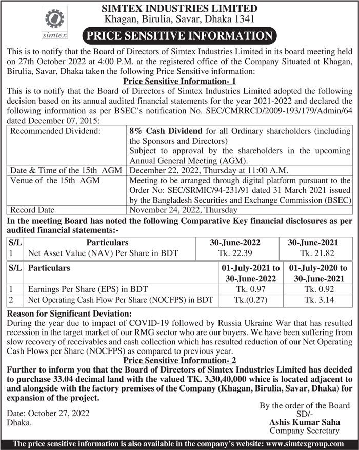 Unclaimed Dividend Notice of Simtex Industries Limited
