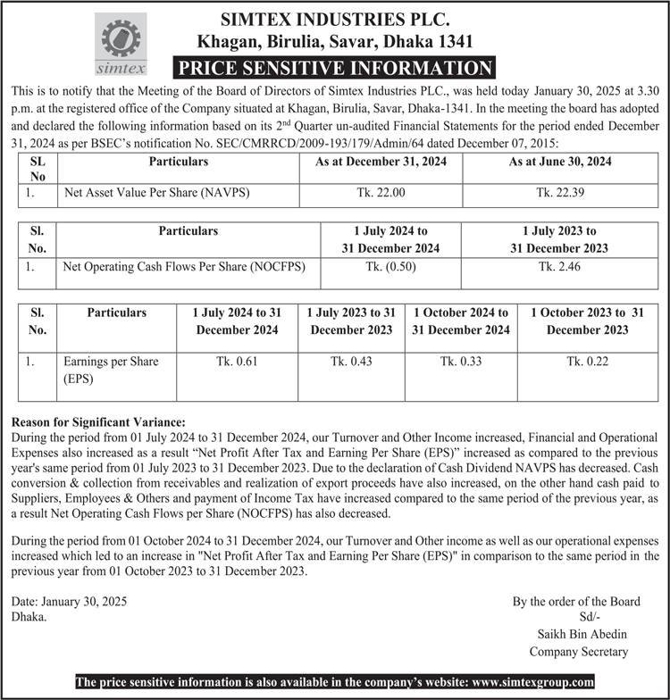 Q2 (Un-audited) Financial Statements of Simtex Industries Limited