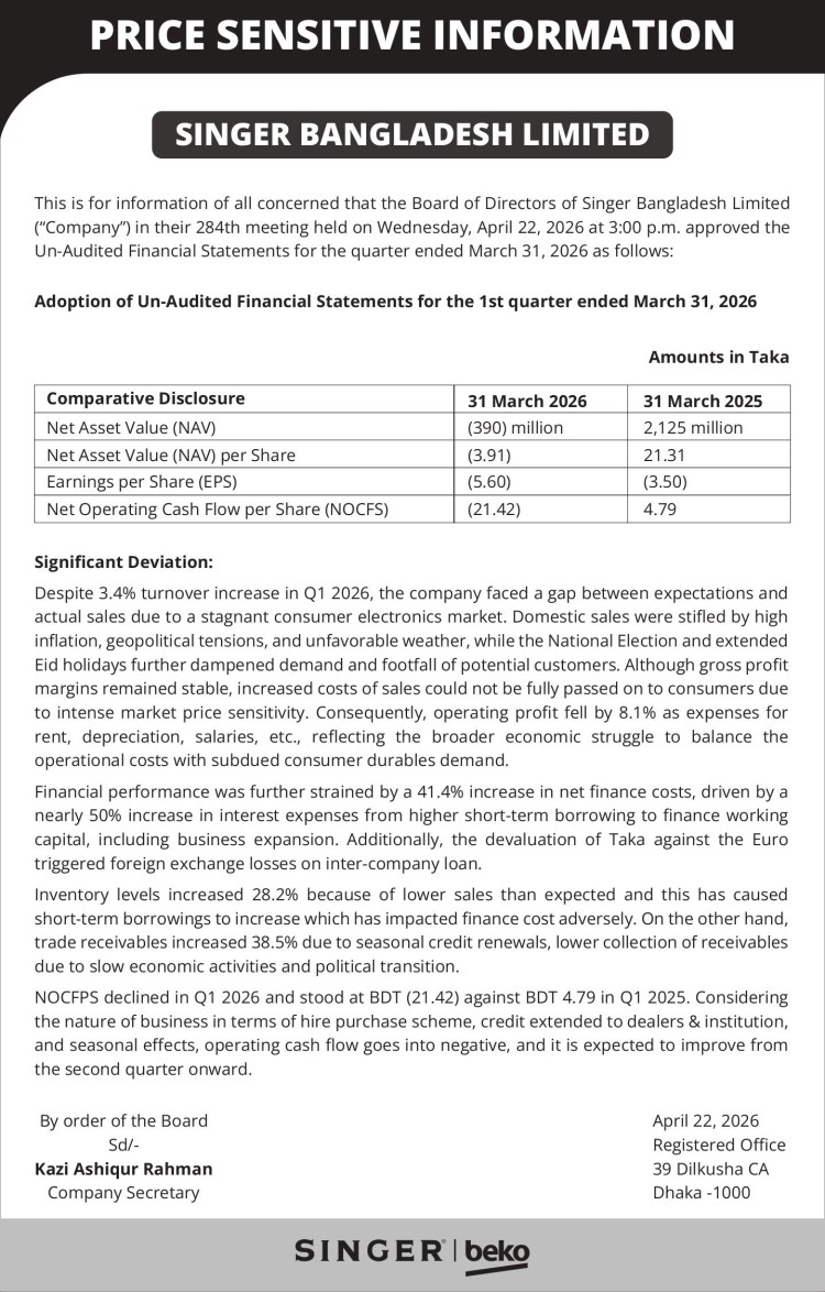 Q1 Un-audited Financial Statements of Singer Bangladesh Limited