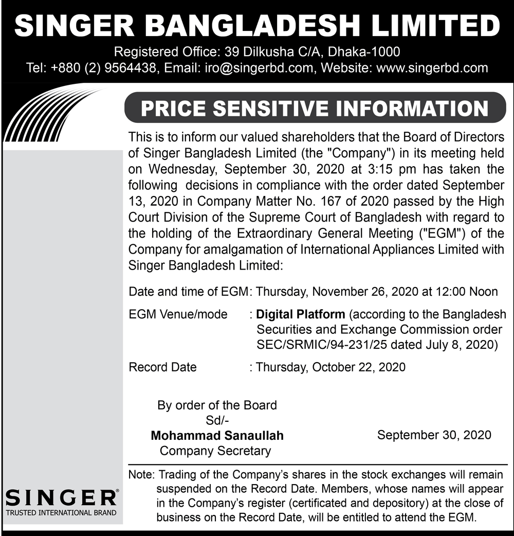Q1 Un-audited Financial Statements of Singer Bangladesh Limited
