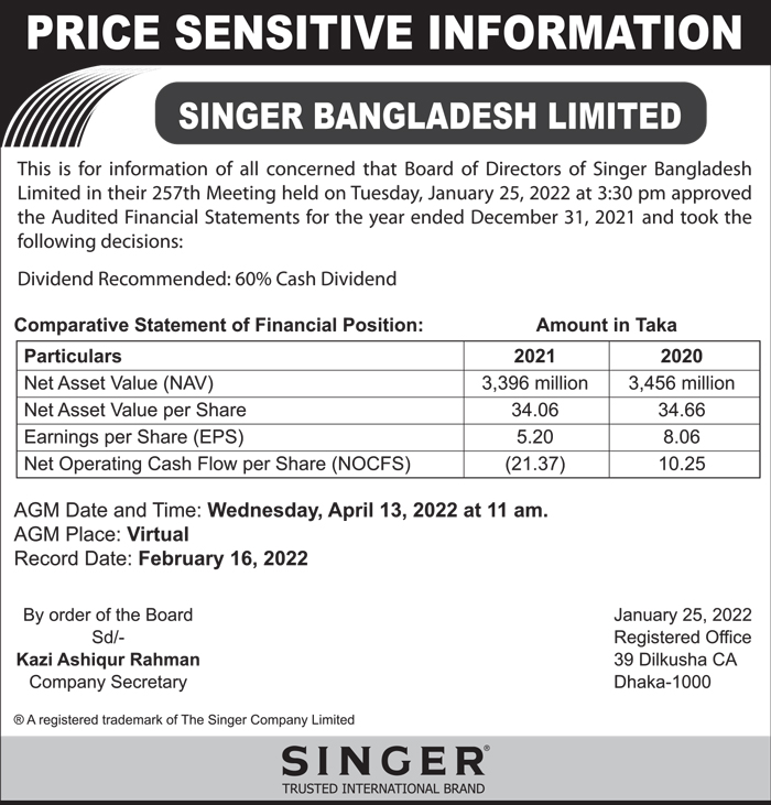 Price Sensitive Information of Singer Bangladesh Limited