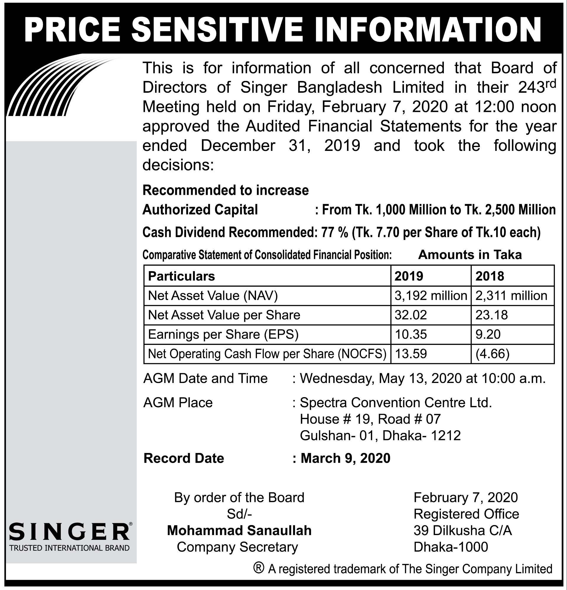 Price Sensitive Information of Singer Bangladesh Ltd.