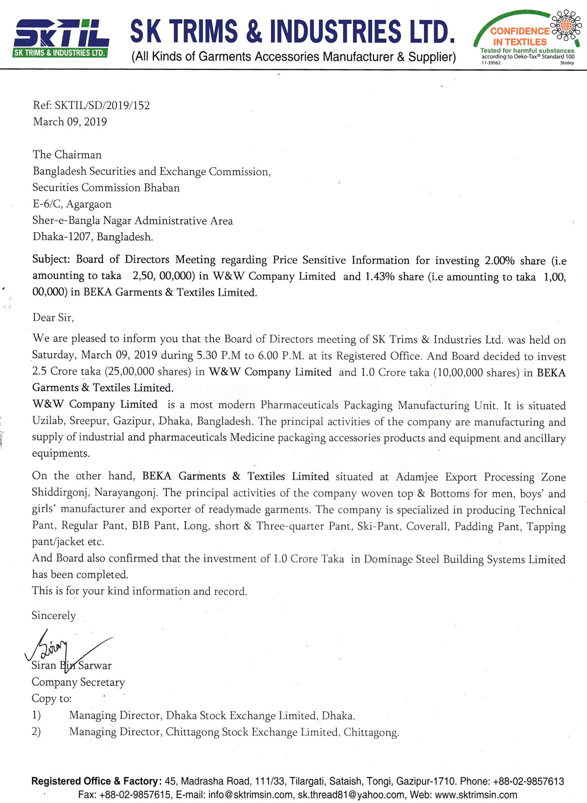 Price Sensitive Information for Q2 Financial Statements of SK Trims & Industries Limited