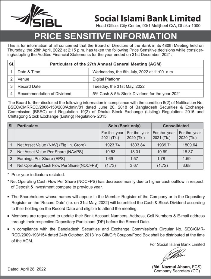 Notice of the 30th AGM of Social Islami Bank PLC.