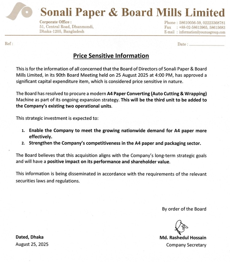 Price Sensitive Information of Sonali Paper & Board Mills Limited