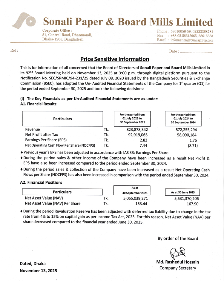 Price Sensitive Information of Sonali Paper & Board Mills Limited