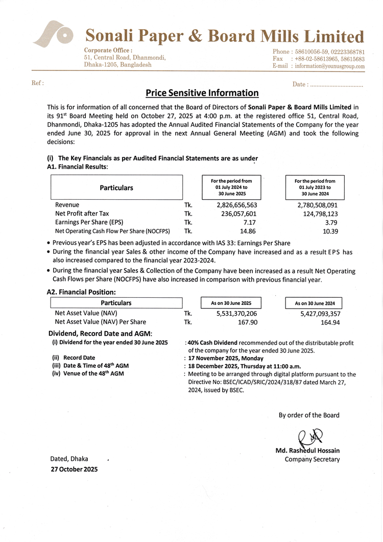 Price Sensitive Information of Sonali Paper & Board Mills Limited