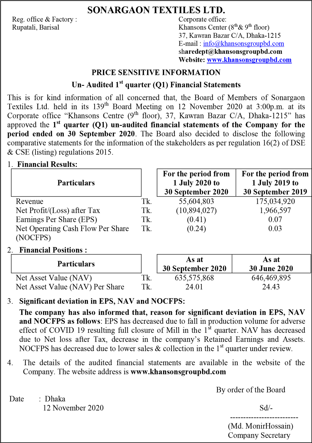 Price Sensitive Information of Sonargaon Textiles Ltd
