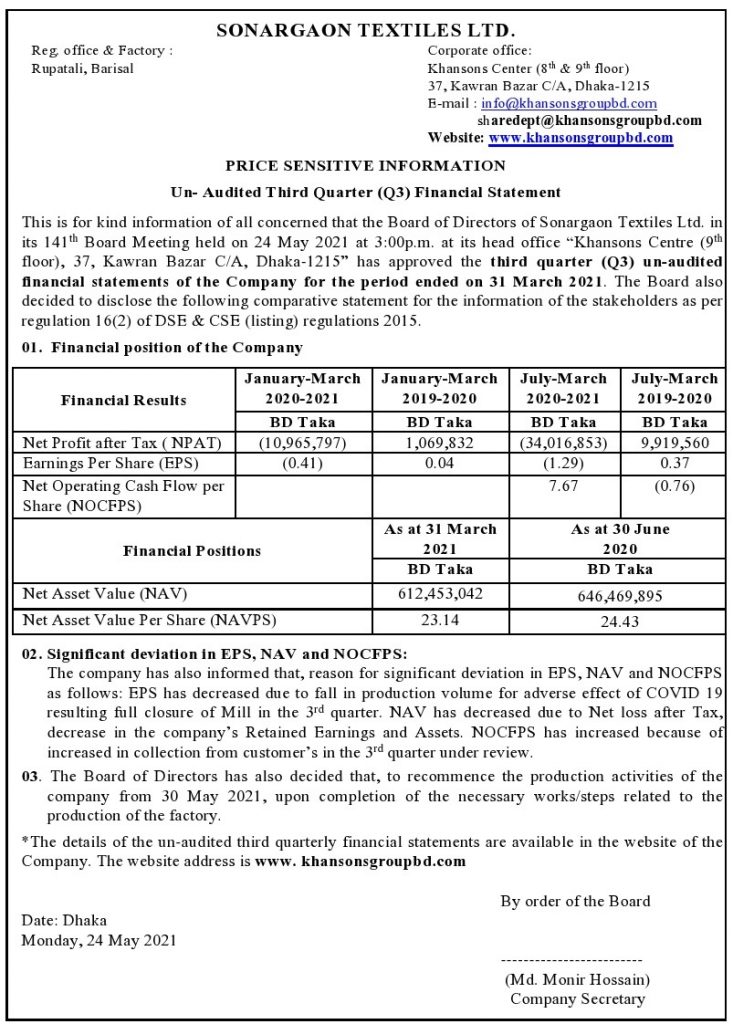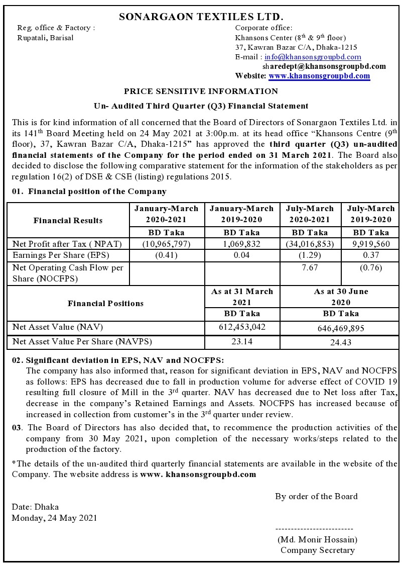 Price Sensitive Information of Sonargaon Textiles Ltd