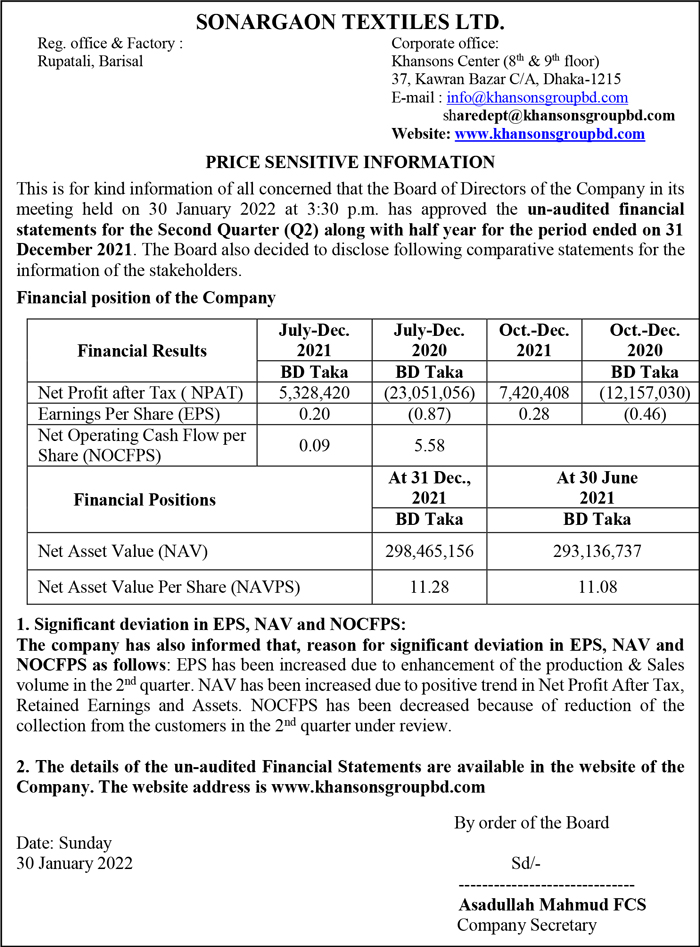 Price Sensitive Information of Sonargaon Textiles Ltd