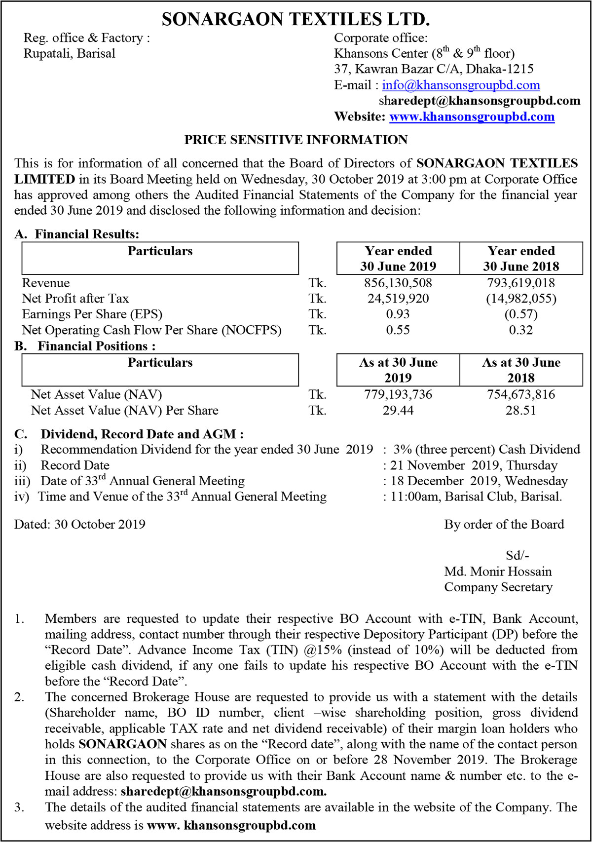 Price Sensitive Information Of Sonargaon Textiles LTD.