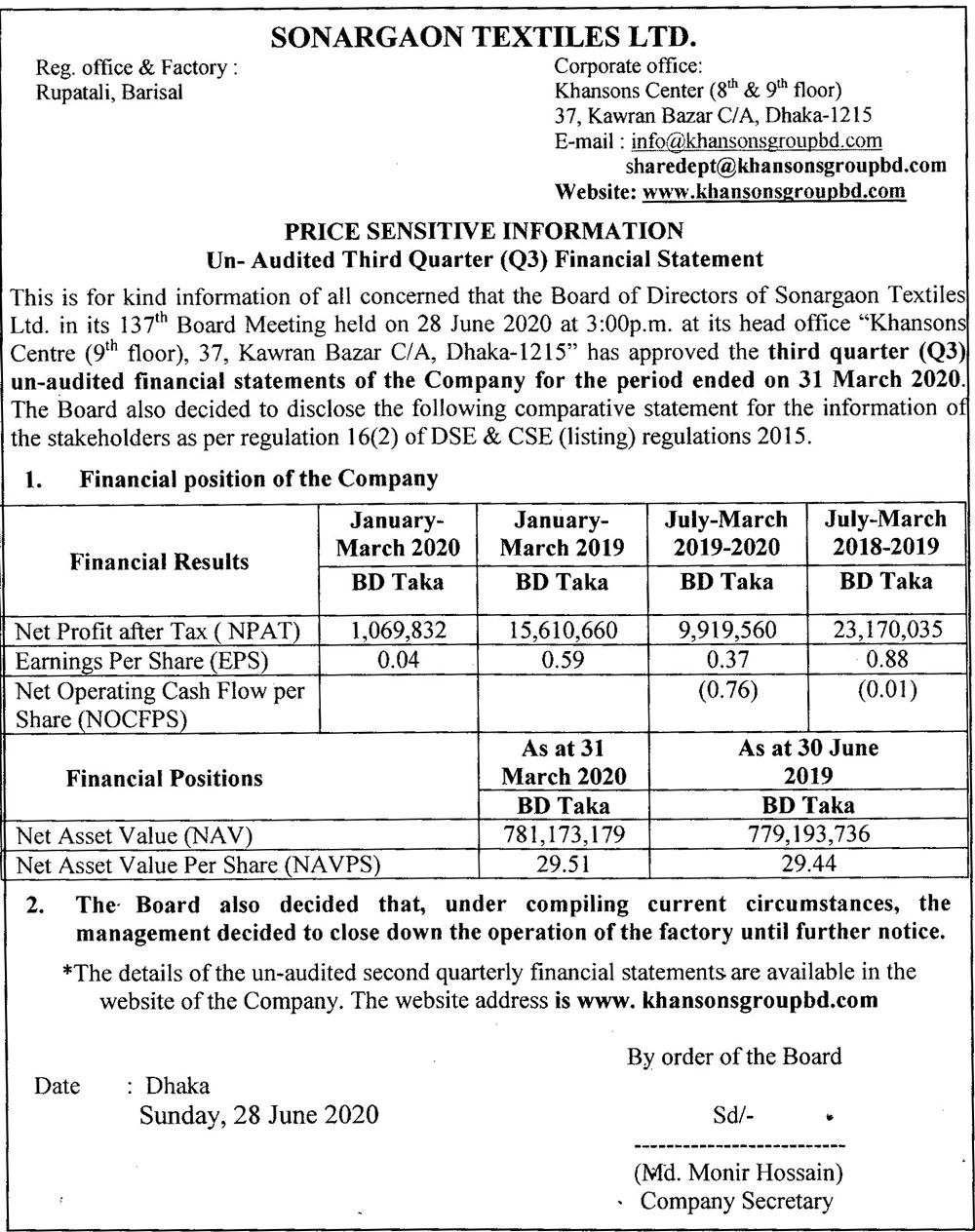Price Sensitive Information of Sonargaon Textiles Ltd