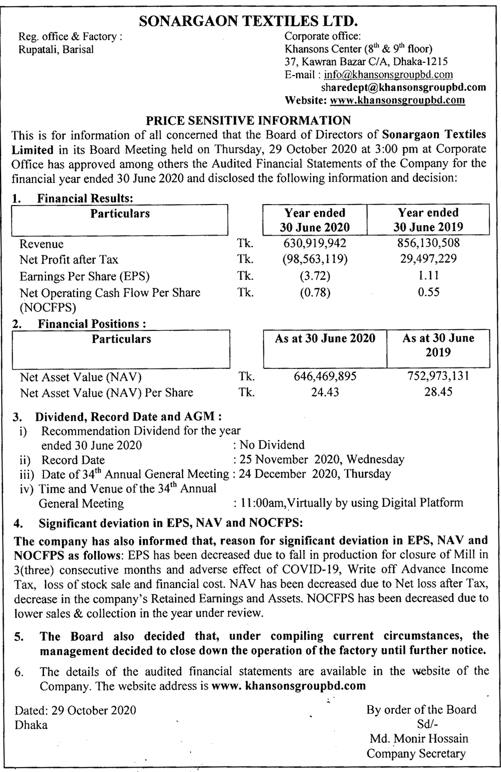 Price Sensitive Information of Sonargaon Textiles Ltd