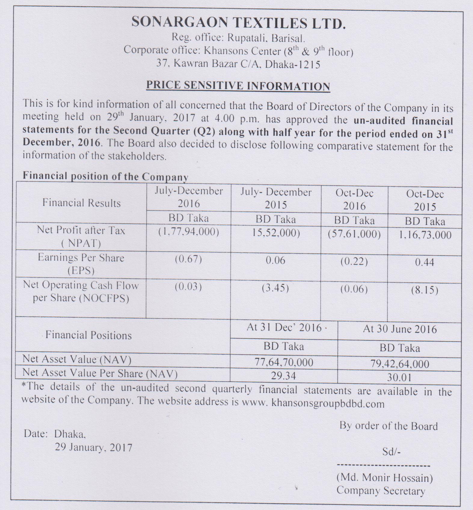 Price Sensitive Information of Sonargaon Textiles Ltd