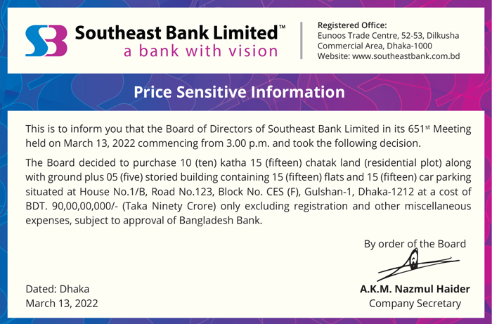 Refixation of Date of the 29th AGM of Southeast Bank PLC