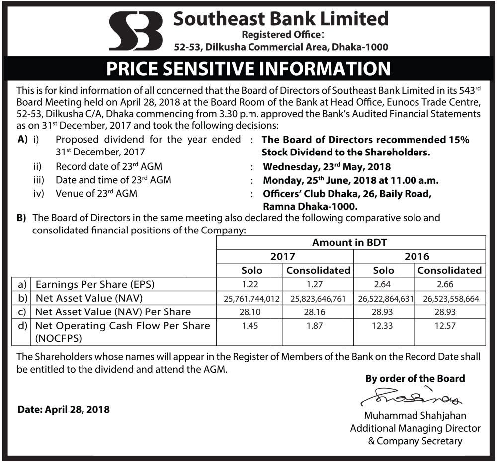 Refixation of Date of the 29th AGM of Southeast Bank PLC