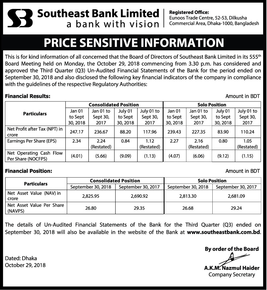 Refixation of Date of the 29th AGM of Southeast Bank PLC