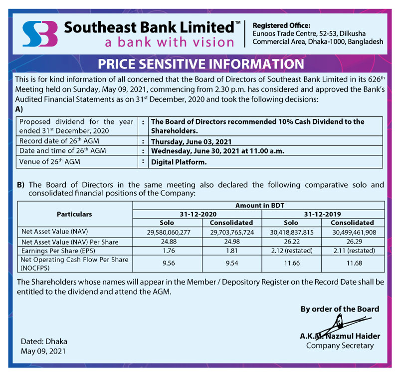 Price Sensitive Information Of SOUTHEAST BANK LIMITED