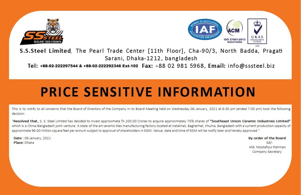 Price Sensitive Information (Q2) of S.S. Steel Limited