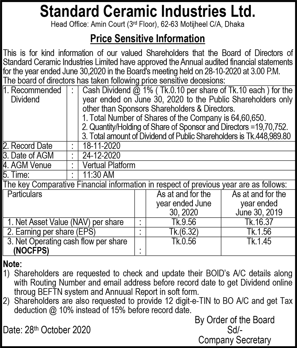 Price Sensitive Information of Standard Ceramic Industries Ltd