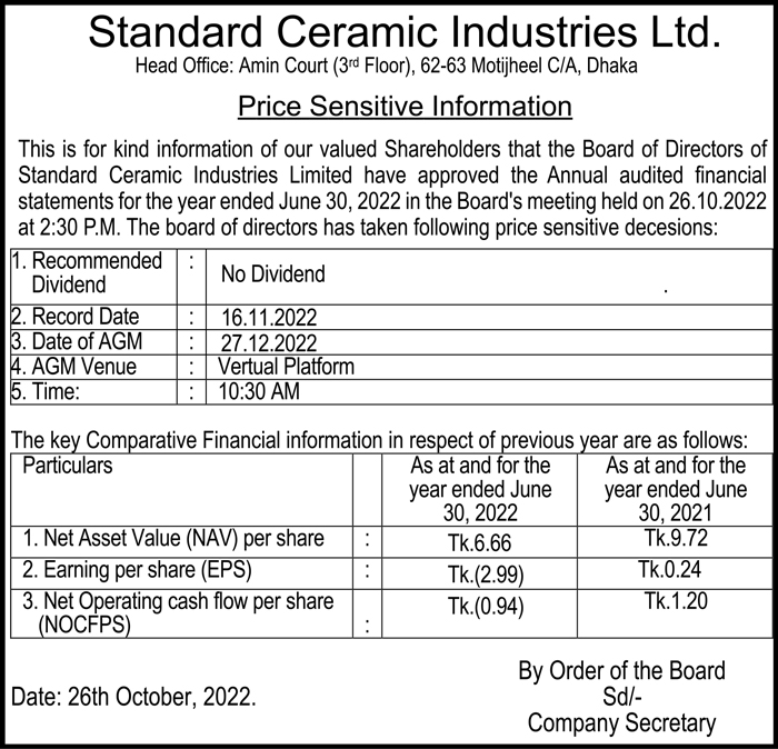 Price Sensitive Information of Standard Ceramic Industries Ltd