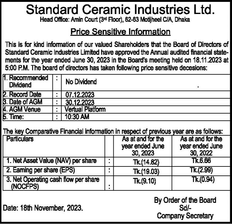 Price Sensitive Information of Standard Ceramic Industries Ltd