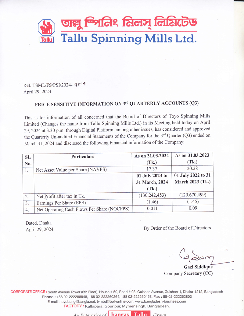 Price Sensitive Information (Q3) of Tallu Spinning Mills Limited