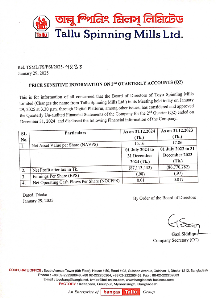 Price Sensitive Information of Tallu Spinning Mills Limited