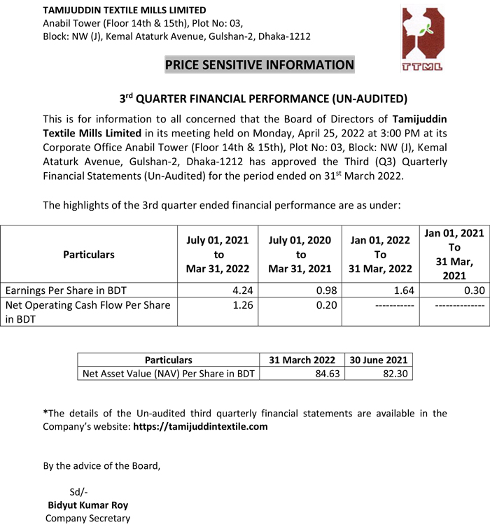 Price Sensitive Information (Q3) of Tamijuddin Textile Mills Limited