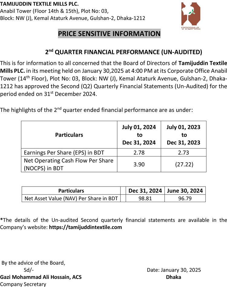 Price Senstive Information (Q2) of Tamijuddin Textile Mills Limited