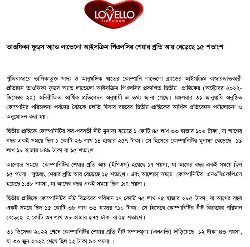 Price Sensitive Information of Taufika Foods And Lovello Ice-Cream Plc.