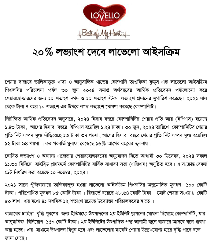 Price Sensitive Information of Taufika Foods And Lovello Ice-Cream Plc.