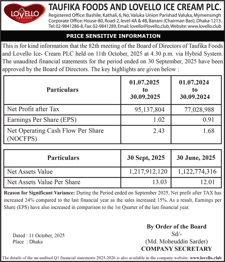 Price Sensitive Information of Taufika Foods And Lovello Ice-Cream Plc.