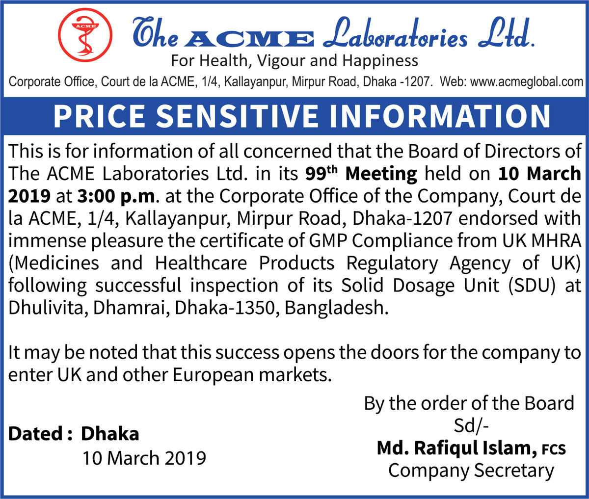 Price Sensitive Information of The ACME Laboratories Ltd.