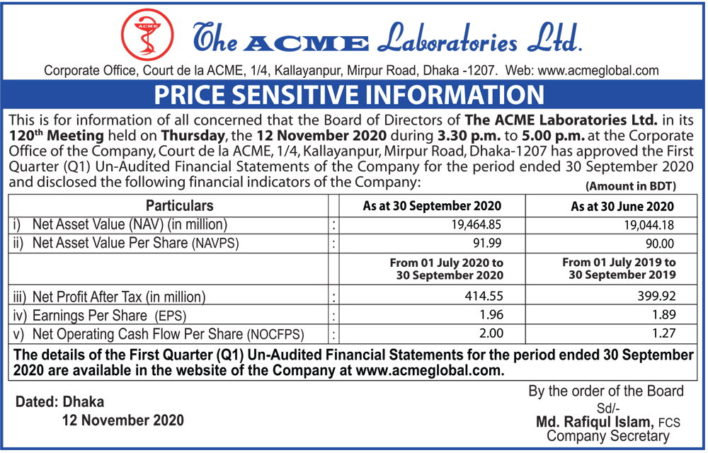 Price Sensitive Information of The ACME Laboratories Ltd.