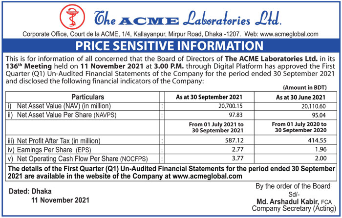 Price Sensitive Information of The ACME Laboratories Ltd.