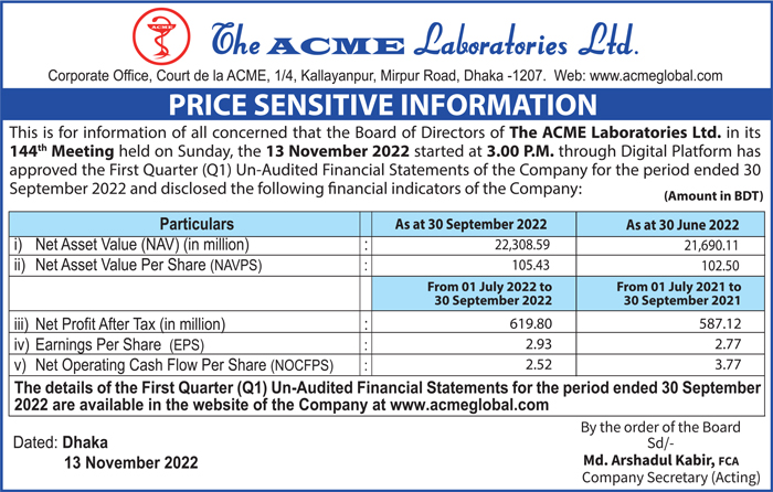 Price Sensitive Information of The ACME Laboratories Ltd.