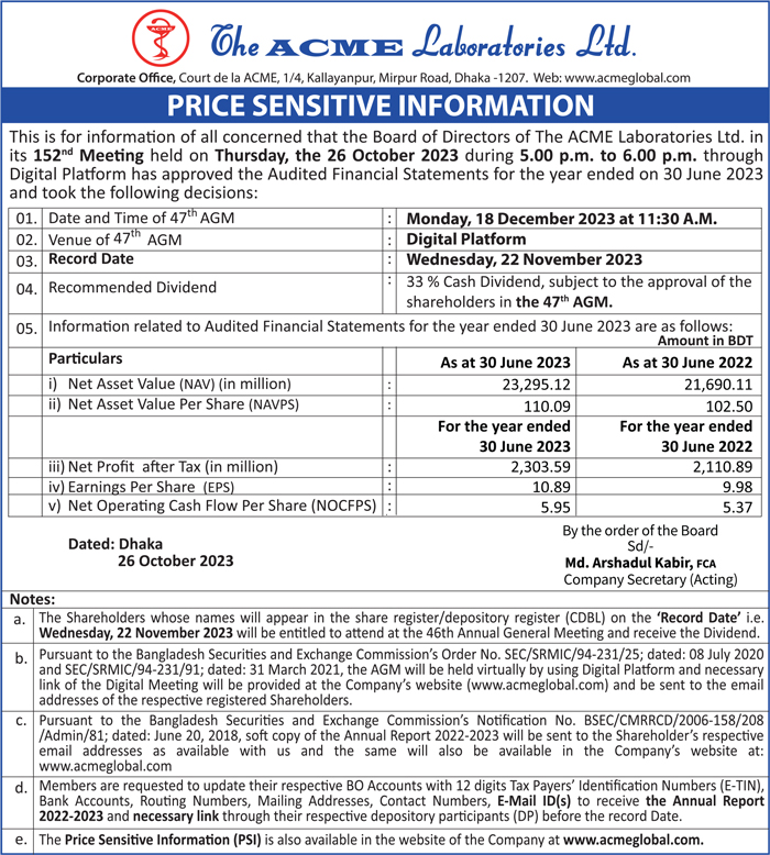 Price Sensitive Information of The ACME Laboratories Ltd.