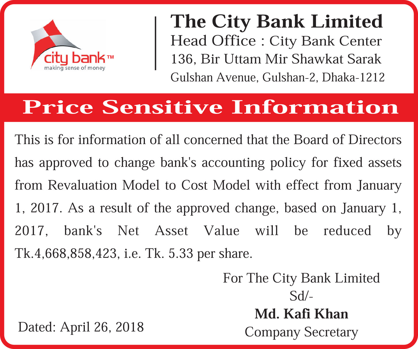 Price Sensitive Information of The City Bank Limited