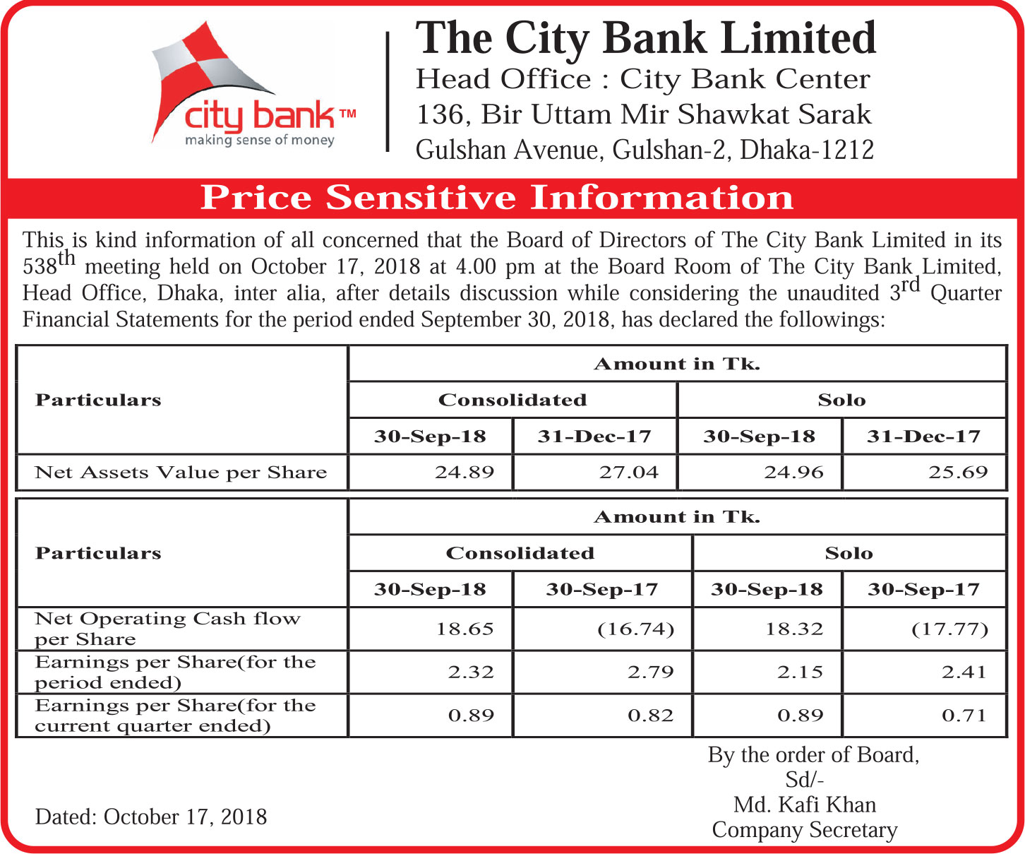 Price Sensitive Information of The City Bank Limited
