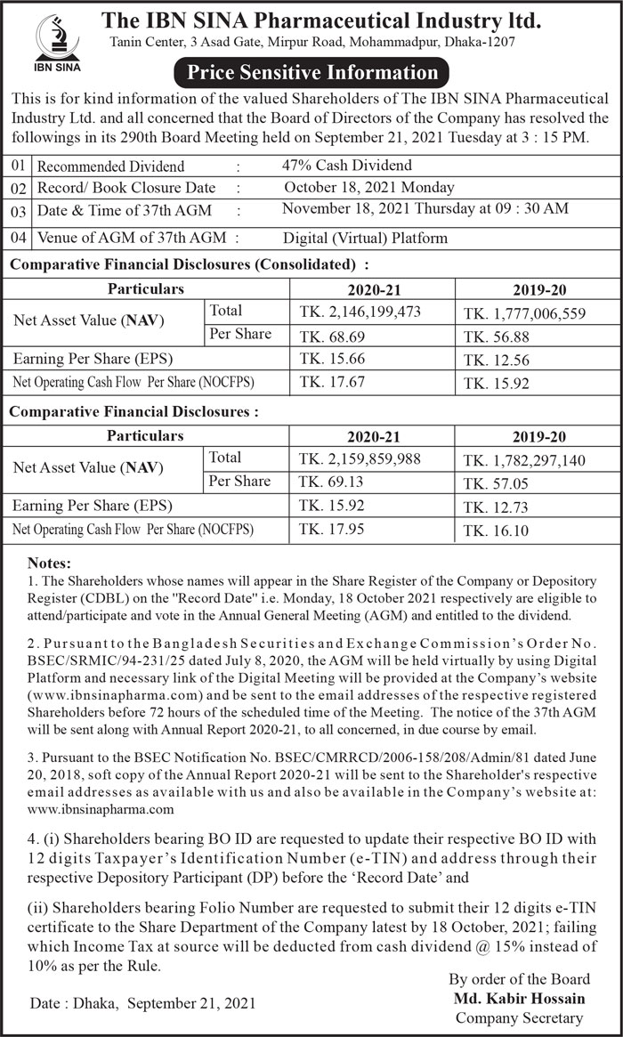 Price Sensitive Information of The IBN SINA Phamaceutical Industry PLC.