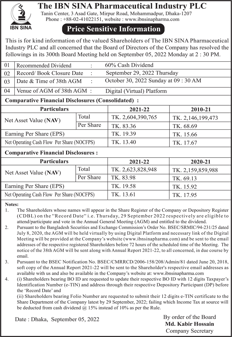 Price Sensitive Information of The IBN SINA Pharmaceuticals Industry PLC