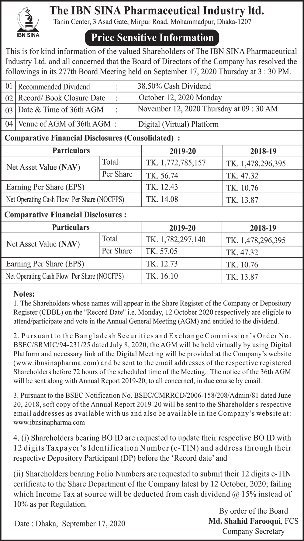 Price Sensitive Information of The IBN SINA Pharmaceutical Industry PLC