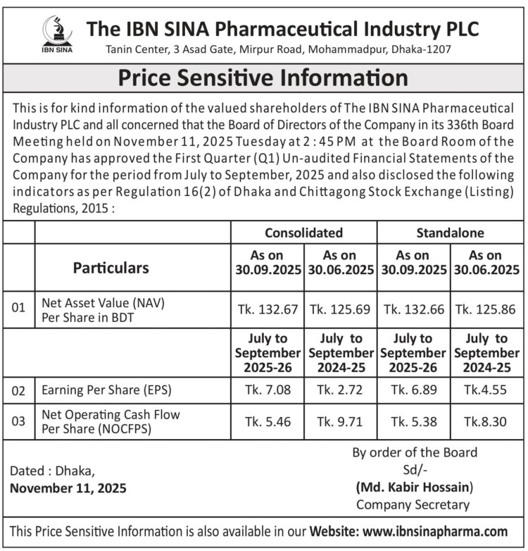 Price Sensitive Information of The IBN SINA Pharmaceutical Industry PLC