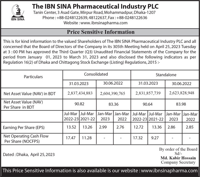 Price Sensitive Information (Q3) of IBN SINA Pharmaceutical Industry PLC.