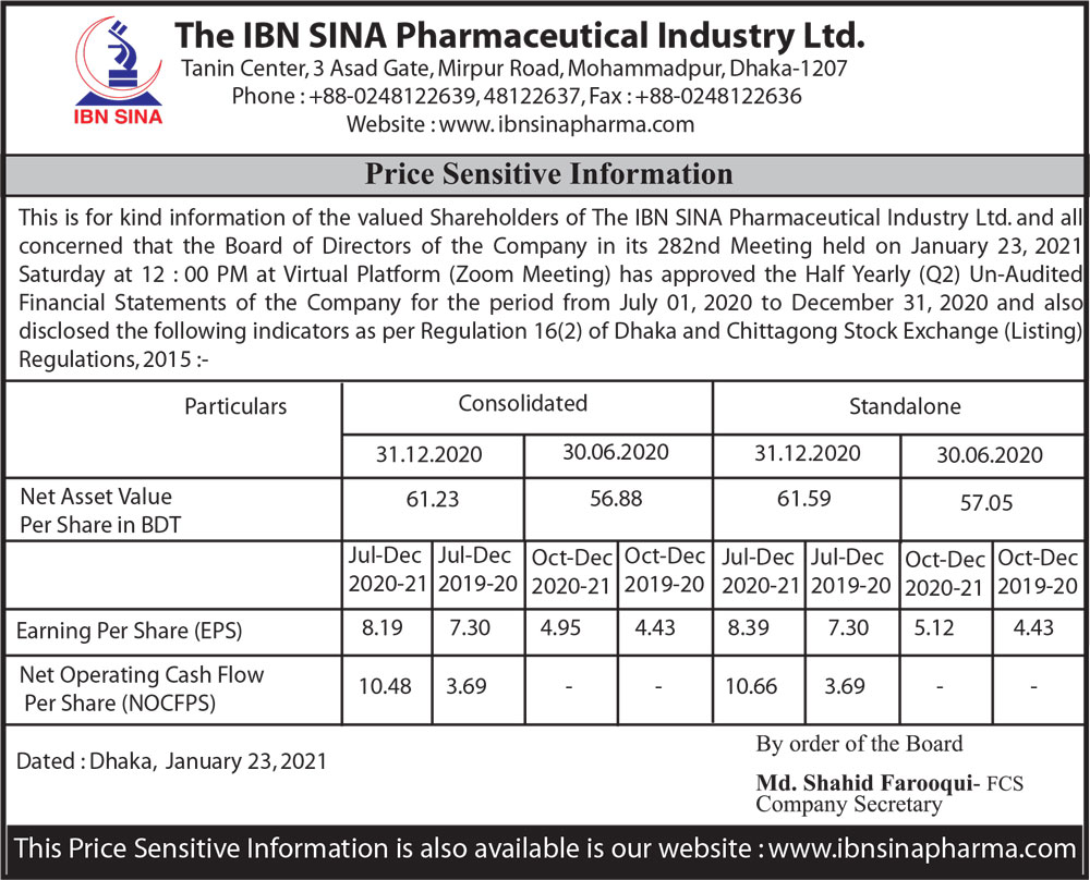 Price Sensitive Information Of THE IBN SINA Pharmaceuticals Industry Ltd.