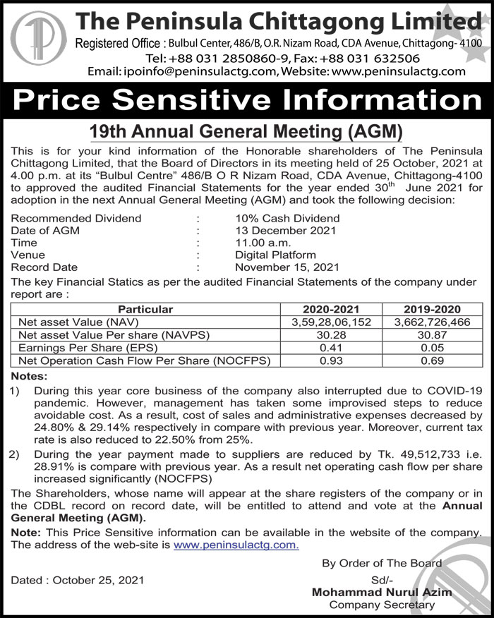 Price Sensitive Information of The Peninsula Chittagong Limited