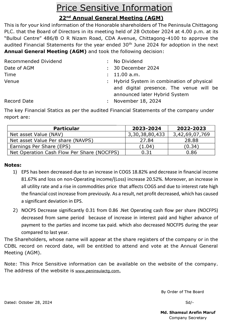 Price Sensitive Information of The Peninsula Chittagong Limited