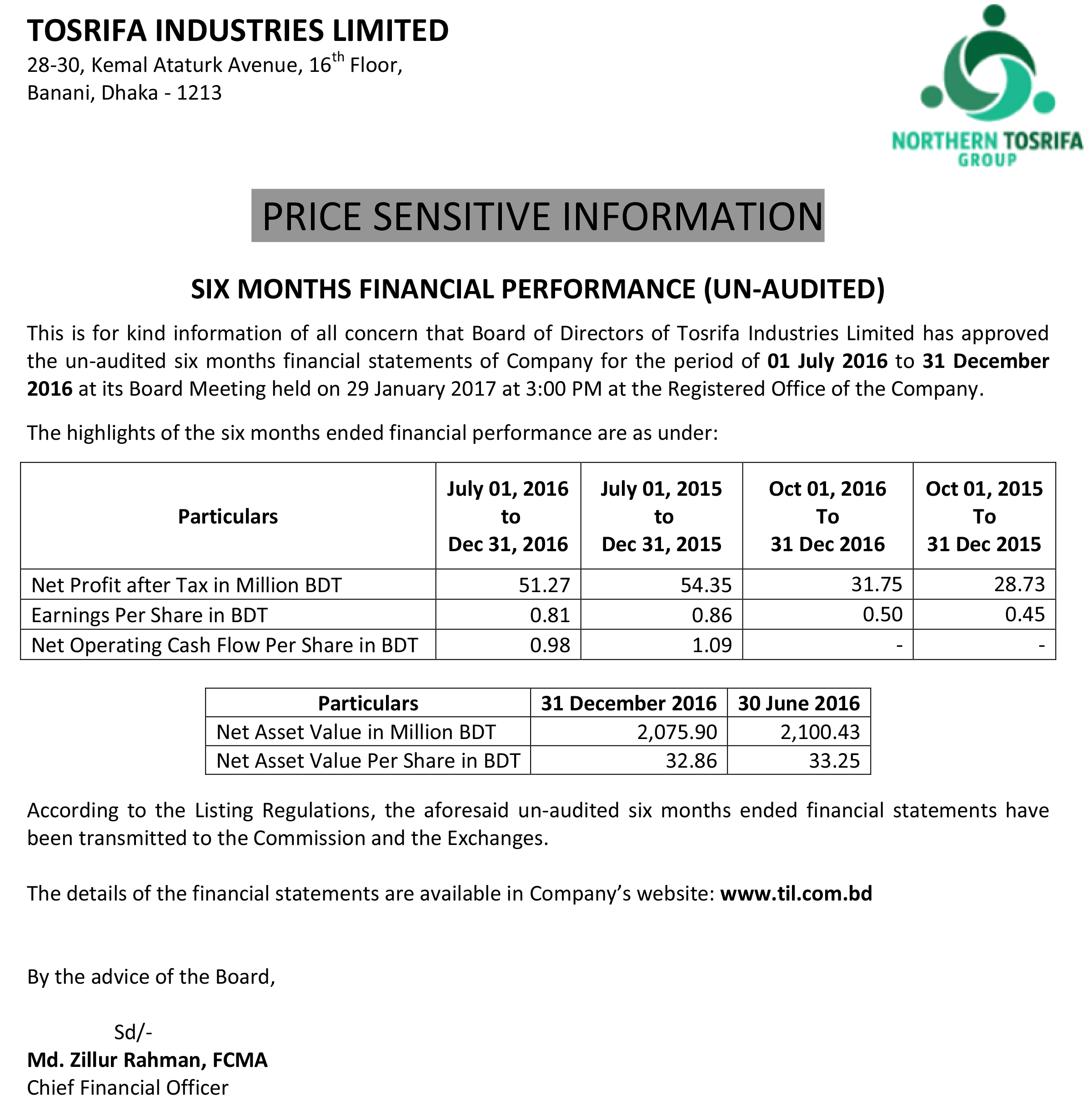 Price Sensitive Information of Tosrifa Industries Limited